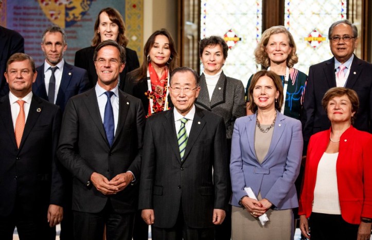 Gasten bij de start van het nieuwe klimaatbureau, zoals premier Rutte, oud-VN-baas Ban-ki Moon en Microsoftoprichter Bill Gates. Foto: Ministerie van Infrastructuur en Watetstaat.