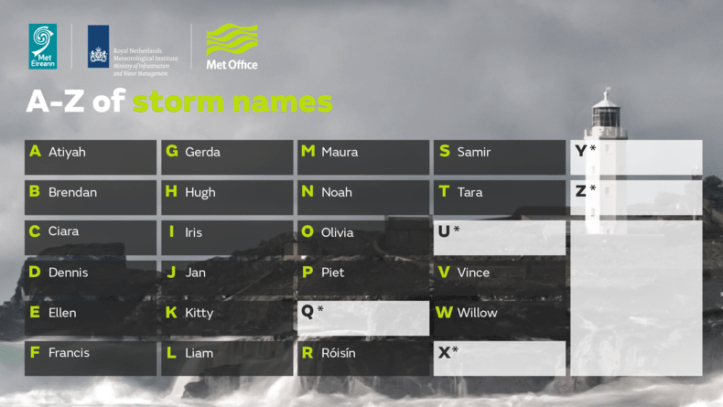 Stormen krijgen mannen- en vrouwennamen. De Q, U, X, Y en Z worden niet gebruikt, om te voldoen aan internationale afspraken over weernamen. Nederland heeft de namen Francis, Gerda, Iris, Jan, Kitty, Olivia, Piet en Samier ingebracht voor de regio West. Jan refereert aan de eerste weerman op radio en tv, Jan Pelleboer, en aan schrijver Jan Buisman. Kitty verwijst naar Kittie Koperberg, de joodse medewerkster van het KNMI die in de Tweede Wereldoorlog omkwam.