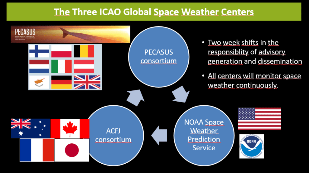 Voor de luchtvaartsector is er nu een speciaal ruimteweerbericht. Een groep weerbureau’s over de hele wereld werkt daarvoor samen. Ze waarschuwt bijvoorbeeld voor zonnestormen die communicatie- en navigatieapparatuur kunnen verstoren.